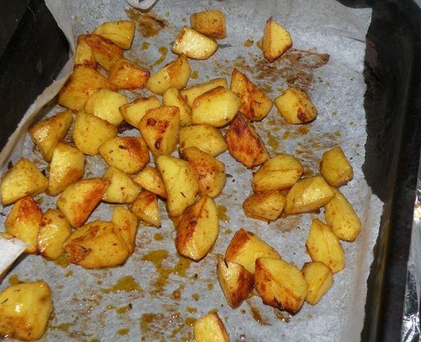 Acest amestec se pune peste cartofi, amestecand bine iar apoi acestia se aseaza in tava de copt tapetata cu hartie de copt si foarte putin ulei de masline.