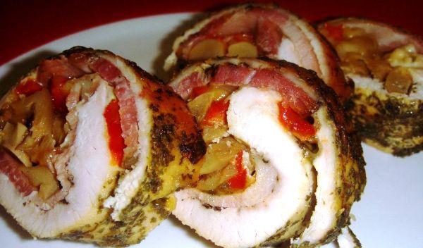 Mod de Preparare: Pieptul de pui se imparte in 2 si se taie astfel incat sa rezulte o bucata intinsa si subtire, care se bate cu ciocanul de carne. Apoi se sareaza si se pipereaza din belsug cu piper proaspat macinat. Se taie toate ingredientele pentru umplutura fasii subtiri si se aranjeaza uniform pe cele doua bucati de carne, care apoi se ruleaza si se strang cu o sfoara. Se incinge ulei intr-o tigaie si se rumenesc bine cele doua rulade pe toate partile. Se scot apoi intr-un vas termorezistent si se presara sare, piper, cimbru si boia peste ele. Se pune in vas un pahar de vin, unul de apa, cateva foi de dafin si eventual cativa catei de usturoi. Se da la cuptor cel putin o ora jumatate, intorcand din cand in cand rulada pe toate fetele. Se taie rece. Variante de umplutura sunt bineinteles nenumarate: ou fiert, mazare, frunze de spanac, ciuperci. Este excelenta la micul dejun sau pentru un sandvis consistent la servici.