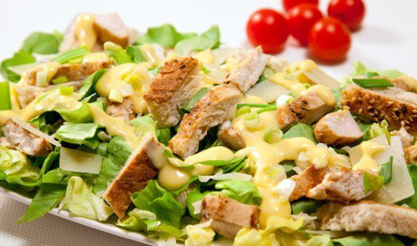 Mod de Preparare: Pieptul se bate cu ciocanul pentru şnițel. Se amestecă condimentele pentru pui între ele apoi se adaugă peste pieptul de pui. Se unge apoi cu ulei si se pune în tigaia încinsă tip gril. Se prăjeşte 5-4 minute pe fiecare parte. Între timp salata se rupe se spală si se pune într-un bol înalt. Puiul se taie bucăți şi se pune peste salată apoi telemeaua şi porumbul. Sosul se face amestecând bine bine toate incredientele pentru el într-un castronel. Sosul se pune peste salată şi se amestecă totul foarte bine.