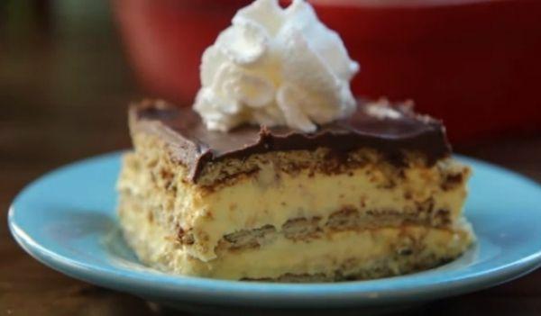 Mod de preparare: Bate frişca. Într-un bol, amestecă bine budinca de vanilie şi laptele, apoi toarnă amestecul peste frişcă. Într-o tavă dreptunghiulară, de aproximativ 23 x 33 cm, pune un strat de biscuiţi mărunţiţi, peste care adaugi jumătate din budincă, apoi un alt strat de biscuiţi, peste care torni cealaltă jumătate de budincă şi ultimul strat de biscuiţi, apoi glazura. Ţine prăjitura ecler la rece peste noapte sau cel puţin 4 ore înainte de a o servi.