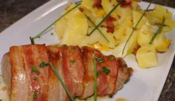 Mod de Preparare: Cartofii ii curatam de coaja si ii taiem cubulete sau doar ii taiam in jumatate. Ii punem intro oala cu apa care clocoteste si in care am pus o lingurita de sare. Lasam la foc mediu sa se fiarba circa 8-10 minute. Intre timp, spalam bine muschiuletul de porc, il taiem in doua bucati egale, scoatem grasimea si pielitele de pe el, il asezonam si il punem deoparte. Cand cartofii s-au fiert (dar nu de tot), ii scoatem si ii scurgem de apa. Ii punem intrun vas Jena, presaram un pic de sare si cateva frunzulite de rozmarin. Luam o tigaie, punem 1 lingura de ulei de masline la incins si cand totul e fierbine, punem usturoiul zdrobit (tocat) si cateva frunze de rozmarin proaspat. Peste ele, punem muschiuletul de porc si incepem sa-l prajim la foc mare, cateva minute dupa care il intoarcem pe partea cealalta. Pana se prajeste muschiuletul de porc, pregatim baconul in asa fel incat sa infasuram muschiuletul cu feliile de bacon. Dupa ce i-am infasurat, ii punem inapoi in tigaie, iar tigaia o introducem in cuptorul care deja a fost incins la 220ºC! Turnam si sosul care s-a format in tigaie la prajirea muschiului, peste carne.Incepem sa pregatim cartofii taranesti, pana stau muschiuletii nostri in cuptor. Intr-o alta tigaie, punem 1 lingura de ulei de masline, punem 4 felii taiate in jumatate le punem in tigaie si peste ele aruncam ceapa taiata juliene, si asteptam sa se rumeneasca frumos si baconul si ceapa.