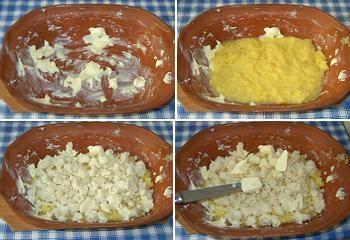 Acoperim cu inca o treime din mamaliga si repetam cu branza telemea, celelalte doua oua, unt si, in final, ultimul strat de mamaliga.