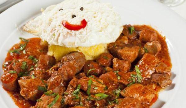 Mod de Preparare: cantitatile ajung cam pentru 5-6 portii pulpa de porc si costita (fara os) taiate cubulete se pune la prajit in putin ulei. Dupa ce s-a aurit un pic se adauga cam o cana de apa si se lasa sa se inabuse bine pana ce carnea este aproape fiarta. Adaugam ficatul si el taiat cubulete si se mai fierbe inca 15 min... din cand in cand adaugand cate putina apa sa nu se arda. Dupa ce ficatul s-a patruns punem si carnaciorii taiati feliute si potrivim de sare si piper. La final adaugam rosiile in bulion (nu inainte de a le zdrobi bine cu furculita) si usturoiul pisat. Lasam la foc mic inca vre-o 10 min. Se serveste pe farfurie alaturi de mamaliguta fierbinte si branza de burduf se mai poate pune si un ou ochi.