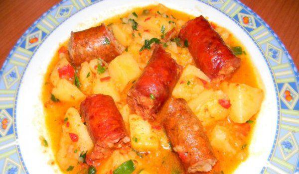 Mod de Preparare: Acum ca stabilit de ce avem nevoie sa trecem la treaba! Carnatii iitaiati felii de cca 2-3 cm, ceapa tocata marunt, iar cartofii sferturi, merg si cuburi cum vreti voi. In cratita in care urmeaza sa pregatim mancarea, punem putin ulei si calim ceapa. Cand aceasta incepe sa prinda culoare, adaugam si carnatii. Lasam sa se prajeasca putin si apoi punem si cartofii. Mai lasam cca 10 min pe foc mic, amestecand din cand in cand. Intre timp amestecam bulionul cu apa sau supa (calda) si turnam peste cartofii, atat cat sa ii acopere, nici mai mult nici mai putin! Totul se acopera cu un capac si se lasa sa fiarba incet la foc mic, amestecand din cand in cand, pana ce sosul incepe sa scada. La sfarsit condimentam cu sare si piper, adaugam si verdeata si gata! Mancati cu muraturi!