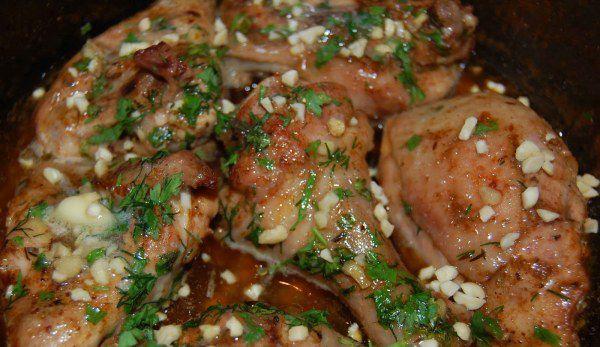 Mod de preparare: Cuptorul se preîncălzeşte la 200 de grade Celsius. Într-o cratiţă adâncă se încinge uleiul (dacă se optează pentru unt, acesta se lasă să se topescă, la foc mediu). Se adaugă carnea şi se lasă să se rumenească. Când carnea a căpătat o culoare aurie uniformă, se scoate din tigaie. În grăsimea rămasă se pune usturoiul. Se lasă câteva secunde cât să-şi desfacă aroma, apoi se adaugă ierburile aromatice, vinul şi smântâna. Se amestecă uşor, se adaugă carnea, se potriveşte de sare şi de piper şi se dă la cuptor 15-20 de minute, până când se rumeneşte. Pulpele se servesc calde.