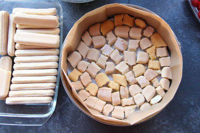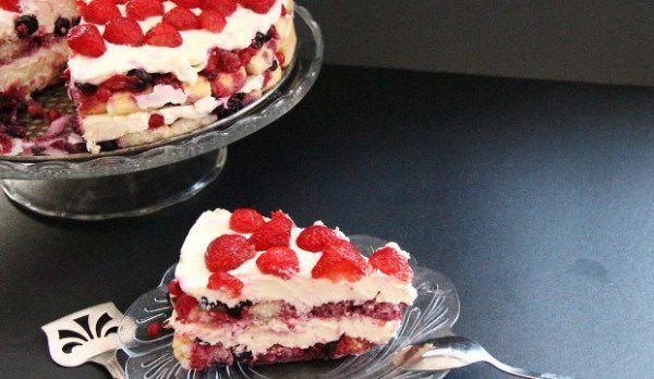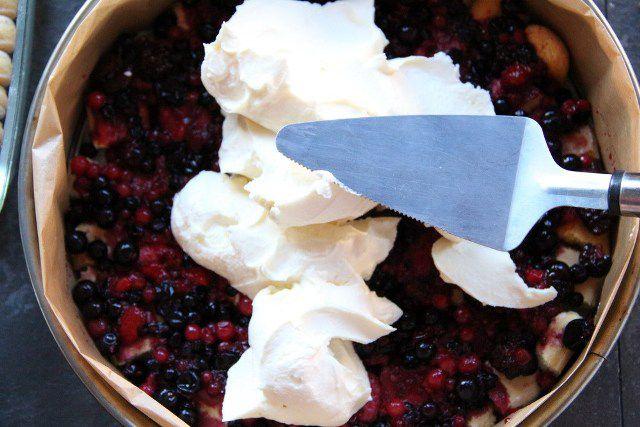 Mod de preparare: Cele 600 grame fructe de pădure (sau zmeură) se amestecă cu o cană zahăr pudră și se strivesc ușor cu furculița până se face ceva zeamă. Cele patru cutii de mascarpone se amestecă cu zahăr pudră și frișcă lichidă. Rupeți pișcoturile în mână în bucăți aproximativ egale. Puneți-le direct într-o tavă (de 28 cm) de tort care se deschide în lateral. Puneți hârtie de copt pe fundul tăvii și pe laterale, exact ca în filmuleț, ca să vă fie mai ușor să o desprindeți. Peste primul strat de pișcoturi puneți un strat subțire de fructe cu zeamă (practic acestea vor înmuia pișcoturile) și apoi un strat de cremă de mascarpone. Repetați operațiunea: pișcoturi rupte, fructe, cremă de mascarpone. Ornați cu fructele proaspete, fără zahăr. Fructele de ornament pot varia în funcție de preferințe: căpșuni, zmeură, afine ori chiar boabe de rodie.