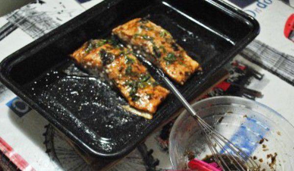 Mod de preparare: Amestecă uleiul de măsline și oțetul balsamic într-un bol. Așază fileurile de somon într-o tavă joasă pentru copt. Freacă fileurile cu usturoiul pisat, apoi toarnă amestecul cu ulei și oțet deasupra lor, întorcându-le pentru a le acoperi bine. Asezonează cu coriandru, busuioc și sare. Lasă timp de zece minute la marinat. Pune somonul la aproximativ zece centimetri distanță față de grillul din partea de sus a cuptorului și lasă timp de 15 minute, întorcând o singură dată.