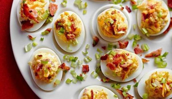 Mod de preparare: Ouăle se curăţă de coajă, apoi se taie în jumătăţi, pe lungime. Gălbenuşurile se scot cu o linguriţă, se pun într-un castron şi se zdrobesc cu furculiţa. Baconul se prăjeşte la foc iute, pe ambele părţi, până când devine crocant. Când a căpătat o culoare aurie uniformă, se scoate pe un prosop de hârtie şi se lasă la scurs. Când s-a răcit, se taie în cubuleţe sau se rupe, după preferinţă. Păstraţi o parte din bacon şi o parte din brânză pentru decor. Restul adăugaţi peste gălbenuşuri. Se continuă cu maioneză, muştar şi pasta wasabi. Amestecul se omogenizează. Ouăle se umplu cu pastă, folosind o linguriţă. Se ornează cu bacon crocant, ceapă verde, brânză Cheddar şi se servesc.