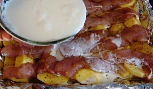 Mod de Preparare: Intr-o tava tapetata cu staniol asezam felii de cartof pe care ii condimentam cu sare si piper. Condimentam si feliile de piept de pui si le asezam peste cartofi stropim cu putin ulei. Separat smantana o amestecam cu apa si turnam in tava peste tot. bagam la cuptor pentru cca 40-45 de minut.