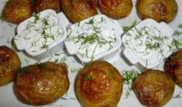 Intre timp pregatim si sosul de iaurt astfel: tocam ceapa marunt, mararul si le punem intr-un bol incapator peste 1-2 borcanele de iaurt cremos, apoi adaugam si zeama de o lamaie, amestecam totul bine pana la omogenizare, iar la final, potrivim de sare si piper! Pentru o aroma si mai intensa putem adauga si 2 catei de usturoi! Sosul astfel obtinut se da la frigider cca jumate de ora - cat timp cartofii sunt inca la copt - astfel incat sa se imbine aromele! Cartofiorii fierbinti se servesc cu sos rece de iaurt!