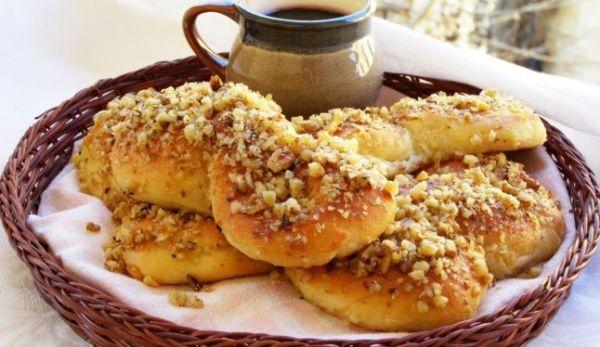 Mod de preparare: Cerneţi făina într-un castron. În mijlocul ei faceţi o adâncitură în care puneţi drojdia dizolvată în puţin lapte amestecat cu 1 lingură zahăr. Lăsaţi vasul la loc cald până când maiaua îşi dublează volumul. Adăugaţi apoi în vas restul de lapte încălzit, treptat, amestecând mereu compoziţia cu o lingură de lemn. Adăugaţi treptat uleiul călduţ şi sarea şi începeţi şi frământaţi aluatul 15 – 20 de minute. Lăsaţi-l să dospească cel puţin 45 de minute, apoi formaţi din el colăcei în forma cifrei 8. Puneţi-i într-o tavă unsă cu ulei şi tapetată cu făină, ţineţi tava în loc cald, ca să crească bine colăceii, ungeţi-i cu ou bătut pe deasupra şi apoi coaceţi-i la foc potrivit, în cuptorul încălzit dinainte. Fierbeţi din apă şi zahăr un sirop mai gros în care adăugaţi şi scorţişoara. Amestecaţi nucile cu zahărul tos. Luaţi colacii calzi, înmuiaţi-i pentru 1 secundă în apă fierbinte şi apoi puneţi-i într-o tavă mai înaltă. Turnaţi peste ei siropul în care aţi amestecat şi mierea şi presăraţi-i cu nucă.
