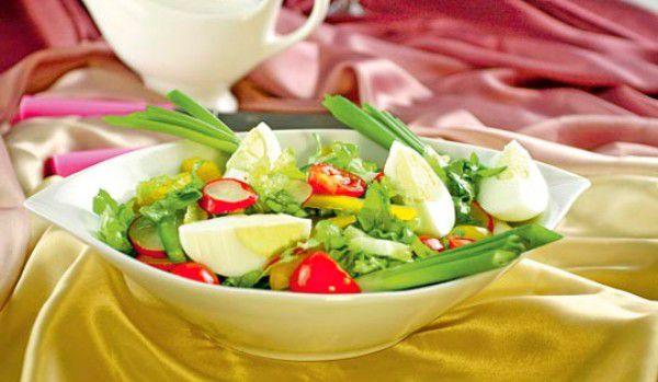 Mod de Preparare: Speli rosiile si le tai jumatati. Cureti ridichile, le speli si le tai rondele. Tai ouale fierte tari in vubulete. Speli ardeiul gras, il cureti de seminte si il tai pe lungime in fasii subtiri. Cureti ceapa, o speli si o tai pestisori. Speli salata verde si o rupi in bucati. Prepari un sos din otet, zeama de lamaie, ulei de masline si 2 linguri de apa. Adaugi, dupa gust, sare si piper. Legumele si ouale taiate le pui in boluri mai mici sau intr-unul mai mare, dar sa fie transplant. Peste ele torni sosul si ornezi salata cu frunze de salata verde rupte marunt sau cu ceapa verde si cu sferturi de oua fierte. Adaugi si cateva rondele de ridichi si cateva jumatati de rosii cherry. Este plina de vitamine.