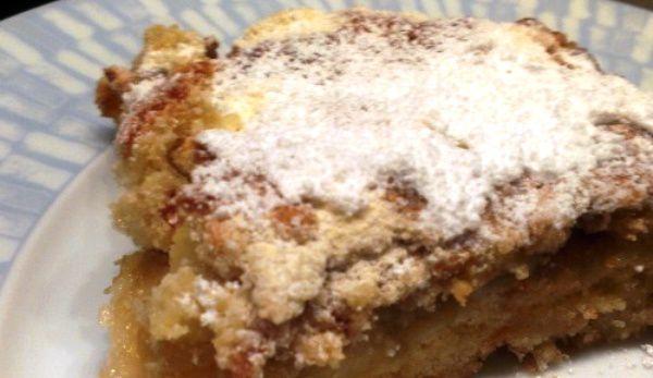 Mod de preparare: Se unge o tavă cu margarină. Se amestecă făină cu grisul şi zahărul, fără apă. Se aşează uscate în tavă într-un strat uniform. Se curăţă merele de coajă şi sâmburi şi se rad pe răzătoarea mare. Se întind în tavă în strat uniform de circa 10 mm deasupra aluatului. Se dă la cuptor 30 minute.
