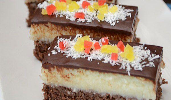 Mod de Preparare: Se bat ouăle cu sare și zahar. Se adaugă praful de copt, cacaua, faina și esența. Se coace 35 de minute la 180 grade. Se hidratează gelatina. Se amesteca laptele cu zaharul și budinca și se fierbe pana se îngroașă. Când e călduță se pune gelatina. Se pune crema peste blat și se lasă la rece o ora. Se topește ciocolata. Când crema s-a întărit se taie prăjitura apoi fiecare bucata se glazureaza cu ciocolată. Se amesteca frișca cu zaharul vanilinat și esența și se bate. Se pune în pos și se decorează prăjitura. Se presară bombonele și se lasă la rece o ora.