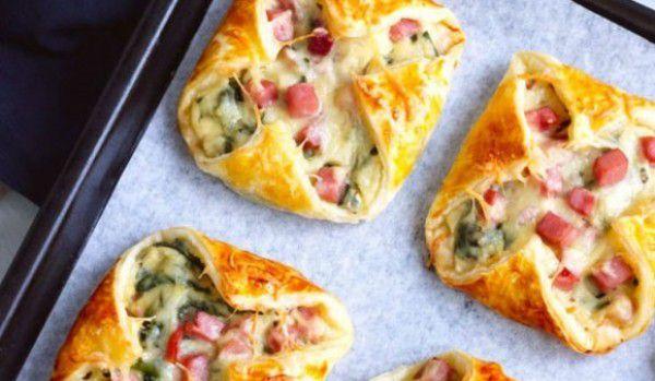 Mod de preparare: Tai aluatul foitaj în pătrate cu latura de 13-15 cm. Le laşi deoparte, în frigider. Încingi cuptorul la foc mare. Pentru sosul bechamel, topeşti untul la foc mediu, într-o cratiţă. Adaugi făina şi sarea şi fierbi, amestecând des, până când textura capătă o culoare galben-pai. Torni laptele cald în două tranşe, amestecând continuu cu o lingură de lemn, până se omogenizează. Fierbi compoziţia până dă în clocot, aproape 7 minute. Reduci flacăra şi fierbi la foc mic până se îngroaşă sosul, aproximativ 10 minute. Dacă vezi că s-au format cocoloaşe, foloseşti un blender vertical ca să omogenizezi. Încorporezi spanacul şi ţii pe foc 1 minut. Adaugi şunca şi caşcavalul şi amesteci bine. Condimentezi cu piper şi nucoşoară, apoi dai deoparte compoziţia. Aranjezi pătratele de aluat pe o tavă în care aşezi hârtie de copt. Pui câte 1-2 linguri din compoziţia de legume şi şuncă, mai razi caşcaval după gust şi închizi pacheţelele, îndoind coluţurile. Baţi un ou şi îl amesteci cu o lingură de apă rece. Ungi pacheţelele umplute şi dai tava la cuptor 20 de minute, până se rumenesc şi se umflă. Le serveşti imediat.