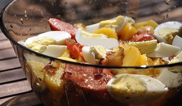 Mod de Preparare: Spalati cartofii, puneti-i la fiert cu sare, in coaja, intr-o oala incapatoare. Cand s-au inmuiat, scurgeti-i, decojiti-i si taiati-i felii. Fierbeti ouale timp de 10-11 minute. Scurgeti apa fierbinte si tineti-le sub jet de apa rece, apoi curati-le coaja si taiati-le in sferturi. Intre timp, incingeti 2, 3 linguri de ulei intr-o cratita si caliti usor ceapa pana se inmoaie Luati tigaia de pe foc si adaugati uleiul ramas, otetul si castraveciorii taiati cubulete. Taiati carnatii in bucati de 2, 5 cm. Adaugati-i si pe ei in compozitie si lasati totul sa se patrunda. Adaugati sare si piper dupa gust. Adaugati cartofii si amestecati bine. Transferati totul intr-un bol mare, de servit. Puneti deasupra sferturile de ou.