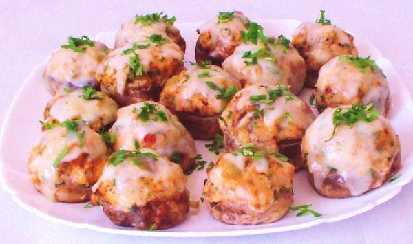 Mod de Preparare: Curatam ciupercile, taiem coziile si tocam marunt, taiem legumele si pieptul de pui marunt... intr-o tigaie punem pieptul de pui la prajit in ulei, condimentam si lasam 2-3 min... adaugam ceapa verde, lasam un min, ardeiul, coziile de ciuperci, rosia si lasam pe foc mediu sa scada... intr-o tava punem hartie de copt, ungem cu unt sau ulei si asezam ciupercile, punem din compozitia de carne si legume, introducem la cuptor cca 20 min, se scoate tava si se pune cascaval taiat feliute subtiri peste ciuperci... se mai lasa la cuptor pana ce se topeste cascavalul. POFTA BUNA!