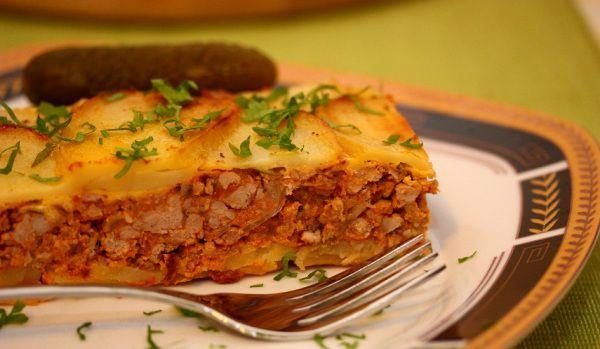Mod de Preparare: Carnea tocata se amesteca cu ceapa taiata cuburi, ouale batute, mararul tocat fin, sarea, piperul si condimente dupa preferinta. Cartofii se curata, se spala si se taie felii. Intr-o tava unsa cu margarina se pune un rand cu felii de cartofi, apoi compozitia de carne tocata iar deasupra alt rand cu felii de cartofi si unul cu felii de rosii. Se acopera tava cu folie de aluminiu si se baga la cuptor. Inainte de a fi gata se da jos folia de aluminiu, se toarna deasupra cele doua oua batute bine si se mai lasa la cuptor pana se incheaga oul.