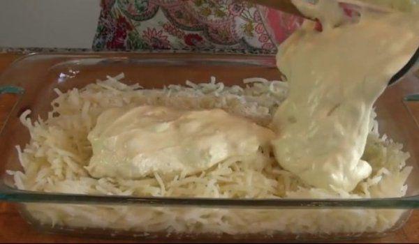Peste ei adăugăm sare și piper, dar putem utiliza și alte condimente. Separat se amestecă unt topit cu smântână și ceapă, apoi se toarnă peste cartofi.