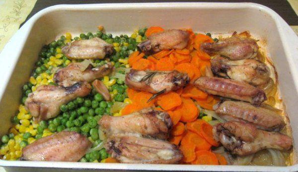 Mod de Preparare: spalam si stergem aripioarele, le frecam cu sare si pe punem la marinat in sosul facut din apa+vin+ulei+soia si verdeata si le lasam la rece o ora. Dupa aceea le asezam intr-un vas termorezistet si turnam sosul peste ele, asezonam cu piper, boia si verdeata si sunt gata pentru a lua drumul la cuptor. Se pun la cuptorul preincalzit pentru 30-35 de minute. Intre timp ne ocupam de legume, pregatim mazarea si ciupercile. Le punem la foc cu o canita de apa si o lingura de ulei de masline, asezonate cu sare si piper. Nu am pus alte arome pentru ca ciupercile sunt foarte aromate si nu mai trebuie nimic in plus. Se combina foarte bine cu aripioarele crocante, este o masa foarte lejera dar plina de arome, am presarat peste el putin marar atat pentru decor cat si pentru aroma care imi place foarte mult.