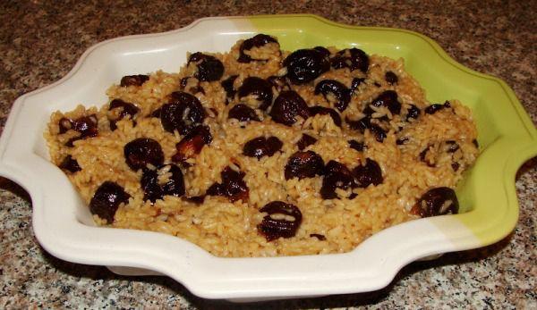 Mod de Preparare: Alegem prunele de codiţe şi eventualele impurităţi, le spălăm în câteva ape călduţe, apoi le punem la fiert în apă curată şi le dăm câteva clocote. Le lăsăm să se răcească, apoi, le scoatem din apă în care au fiert (pe care o păstrăm!) şi scoatem sâmburii. Punem prunele la loc în apă în care au fiert, adăugăm orezul (ales şi spălat în câteva ape), (proporţia: 1măsură orez - 3 măsuri lichid), puţină sare, coajă întreagă (nerasă) de la o jumătate de lămâie şi eventual un bat de scorţişoară. Lăsăm să dea un clocot şi adăugăm zahărul caramelizat stins cu zeamă în care au fiert prunele. Se amestecă uşor şi se lasă să fiarbă la foc mic, cu capac, aprox 40 de minute. Când orezul este gata fiert, scoateţi coajă de lămâie şi băţul de scorţişoară.