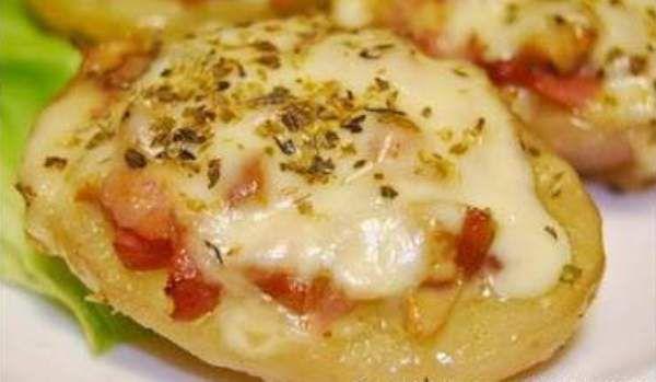 Mod de Preparare: Taiem kaizerul cubulete, ceapa si ardeiul ii tocam marunt. Punem kaizerul la prajit intr-o tigaie teflonata, fara ulei (o sa se topeasca din grasimea lui). Cand e aproape prajit, adaugam ceapa si ardeiul si mai lasam cateva minute sa se caleasca impreuna. Adaugam apoi un sfert de cana de apa, sa se inabuse legumele. Cand apa a scazut, adaugam sunculita si apoi ciupercile. Lasam la racit. Curatam cartofii de coaja si ii taiem in 2, pe lungime. Scobim miezul fiecarui cartof cu ajutorul unei lingurite. Pana executat operatiunea "scobit cartofi", umplutura s-a racit, deci adaugam cascavalul ras pe razatoare. Omogenizam. Umplem cartofii cu aceasta compozitie si ii punem intr-o tava unsa cu unt. Peste fiecare cartof asezam o felie de mozzarella si peste presaram oregano. Dam la cuptorul preincalzit vreo 10-15 min, la foc mare, pana se topeste mozzarella si se rumeneste putin.