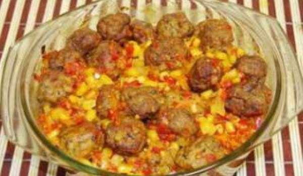 Mod de Preparare: Tocam carnea de pui, amestecam cu ceapa si verdeata, ambele taiate marunt, cu usturoiul zdrobit si cu oul. Se asezoneaza cu sare si piper. Se modeleaza cu mana inmuiata in apa niste perisoare rotunde, care se prajesc in ulei incins. Cand sunt rumene, se scot si se pastreaza la cald (intr-o farfurie acoperita cu folie de aluminiu). Separat, taiem ceapa si ardeiul marunt, iar morcovul il dam pe razatoarea mare. Le calim in cele 2 linuri de ulei, adaugam 2-3 linguri de apa si mai lasam pe foc pana se inmoaie. Adaugam boabele de porumb, rosiile taiate marunt si 100 ml apa. Lasam sa fiarba la foc mic 15 minute. Saram si piperam dupa gust. Punem apoi si perisoarele si bulionul. Turnam compozitia intr-un vas termorezistent (sau daca cratita in care facut tocanita, rezista la cuptor o lasam acolo) si dam la cuptor pentru 15 minute, la foc mare.