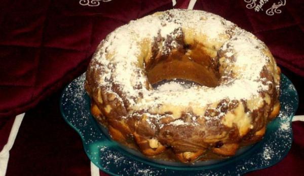 Mod de Preparare: Separam albucurile de galbenusuri, mixam albusurile cu un praf de sare, dupa care mixam separat galbenusurile cu zaharul si uleiul pana se formeaza o compozitia ca maioneza. Amestecam albusurile cu crema de galbenusuri, dupa care ad augam laptele, faina, praful de copt, esenta de vanilie si omogenizam bine compozitia. Ungem forma de copt cu ulei si o tapetam cu faina, apoi turnam compozitia in ea, oprind 2 linguri pentru a o amesteca cu cacaoa si o vom pune deasupra, iar cu o furculita imprastiem prin miscari circulare prin toata tava. Deasupra vom pune stafidele si alunele si dam la cuptor app. 20 de minute la foc mic. Dupa ce s-a racit o scoatem din forma si presaram zahar pudra.