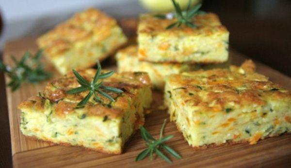 Mod de preparare: Mixăm ouale timp de 3 minute, adăugăm apoi uleiul treptat, ca la maioneză, continuând să mixăm circa 5 minute. Cu o lingură amestecăm încet, cu mişcari circulare, făina amestecată cu praful de copt (cernute), apoi zucchini ras, morcovul ras, brânza rasă, ceapa rasă (toate legumele rase pe razatoarea cu ochiuri mari), sarea şi piperul. Compozitia obţinută o turnăm în tava (20*30 centimetri) tapetată cu hârtie de copt şi o coacem la 180 grade, circa 30 minute (până se rumeneşte uşor deasupra). Lăsam să se răcească, apoi o porţionăm.