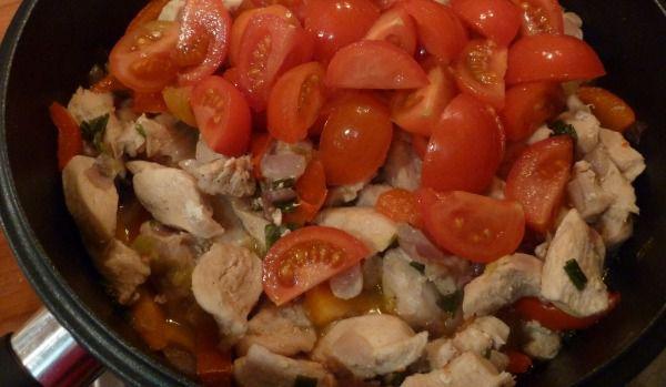 Mod de Preparare: Pieptul de găină se spală și se taie fâșii subțiri. Se prăjește în 2-3 linguri ulei, amestecând până se albește carnea pe toate părțile. Se scoate și se ține la cald. Adăugăm ceapa tocată și călim până devine aurie. Aducem carnea în tigaie și acoperim cu apă. Lăsăm să fiarbă acoperit la foc mic pentru 15 minute. Între timp spălăm roșiile cherry și le tăiem în patru. Încingem o lingură de ulei într-o crăticioară și călim roșiile pentru 2-3 minute. Se adaugă roșiile în tigaie și amestecăm bine. Condimentăm cu sare și piper proaspăt măcinat. Dăm la cuptor pentru 30 minute. Se presară la final după preferință pătrunjel proaspăt tocat sau cimbru. Servim fierbinte.