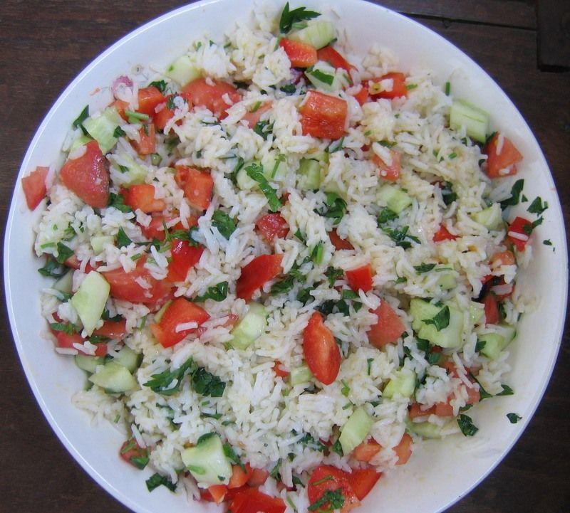 Separat se spala bine si se taie bucatele marunte rosiile si ardeiul. Maslinele se curata de samburi si se taie feliute. Se amesteca orezul cald cu cruditatile taiate marunt, se condimenteaza dupa gust (fiind recomandat busuiocul si sarea), si se serveste.