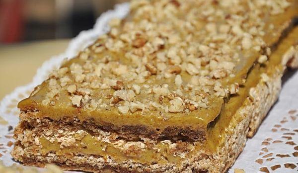 Mod de Preparare Se bat albușurile spumă, se adaugă treptat zahărul și la urmă nucile măcinate. Această compoziție se toarnă într-o tavă mare unsă cu unt și tapetată cu hârtie pergament. Hârtia trebuie și ea unsă bine. Se coace la 180 grade C pentru 30 minute. Pentru cremă se topește ciocolata în lapte, în care adăugăm și zahărul. Se amestecă bine până se topește toată ciocolata. Când s-a răcit se amestecă bine cu untul până obținem o cremă pufoasă. După ce s-a răcit și blatul se va tăia în două. Pe o foaie de hârtie sau folie de aluminiu se presară zahăr pudră. Se așează una din foi (cu partea de sus în jos), se pune crema și se acoperă cu cea de-a doua foaie (pe aceasta nu o mai sucim - o punem exact cum este în tavă). Se presară zahăr pudră și se acoperă cu folia de aluminiu. Se presează un pic cu mâinile și se pune o greutate (eu pun un tocător ceva mai gros). Se dă la rece până a doua zi, când se taie după bunul plac și se servește.