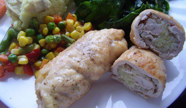 Mod de Preparare: Legumele taiate marunt le calim in putin ulei de masline.Adaugam orezul spalat si lasat in putina apa, sa se umfle. Le mai calim impreuna cateva minute, adaugam o cana de apa si lasam pe foc pana orezul este fiert „al dente”. Potrivim gustul de sare. Lasam sa se racoreasca apoi repartizam orezul pe pieptul de pui taiat felii subtiri, presarat cu sare si piper si rulam cat mai strans posibil. Intr-un vas termorezistent asezam rulourile obtinute, stropim cu putin ulei de masline, presaram cu cimbru, si dam la cuptor pana se rumenesc.