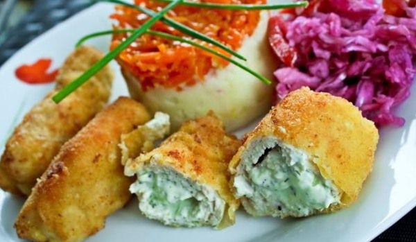 Mod de Preparare: Batut pieptul de pui cu ciocanul, in folie, apoi condimentat, intins crema de branza, si am rulat. Incercat 2 variante, cel mai ok e procedura care se aplica si la sarmale. Lasat rulourile la rece - asta nu e obligatoriu, apoi dat prin faina, ou, pesmet si prajit in ulei de palmier, la foc mic, sa se patrunda. Piure de cartofi stie toata lumea sa faca, pentru morcovii sote: topit untul, caramelizat zaharul brun, apoi adaugat morcovii rasi pe mandolina, foaia de dafin, condimentat, si picurat apa din cand in cand, pana s-au muiat de aproape au mers bine alaturi de varza rosie murata.