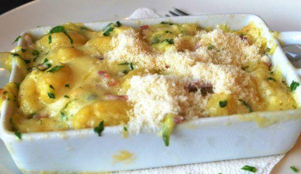 ATENȚIE: nu trebuie să îi lași să se facă până la capăt. Amestecă smântâna cu oul, parmezanul și asezonează cu sare și piper. Taie ceapa julien, pune-o la prăjit în unt. După ce devine ușor aurie și sticloasă pune curcanul tăiat cubulețe. Se lasă la călit puțin, cam până începe să se simtă aroma cărnii fripte de curcan. Separat, dacă vrei, pune la projit niște bacon tăiat mărunt. Scurge cartofii de apă, taie-i dacă nu i-ai tăiat de la bun început. Pune-i în tavă, toarnă sosul și presară deasupra bucățile de curcan ușor fripte. Amestecă ușor toate ingredientele. Presară pătrunjel pe deasupra. Dă la cuptor până se rumenește ușor – circa 30 de minute. După 15 minute, redu la jumătate focul. S-au făcut când cartofii s-au pătruns.
