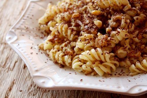 Mod de preparare: Pastele se fierb in apa clocotita cu putina sare si scortisoara, timp de 8 minute. Se scurg si se clatesc cu apa rece. Nucile se toaca si se pun la rumenit in ulei incins. Se amesteca pastele cu nucile, mierea si vinul. Incalziti compozitia la foc mic, timp de 2 minute. La final adaugati zaharul si putin rom.