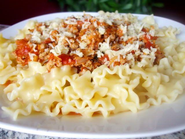 Ingrediente: 500 g spaghete, 4 capatani de usturoi, 4 linguri ulei masline, mustar, 1 lamaie, piper negru, 2 dovlecei, 300 g ciuperci, suc de rosii.