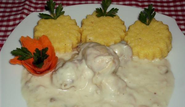 Mod de Preparare: Se taie pieptul de pui in bucati si se fierbe in apa sarata (cam 2 litri de apa), dupa primul clocot se spumeaza si se adauga ceapa si morcovul intregi. Dupa ce a fiert carnea, se scoate pe un platou. Se strecoara un litru de supa, doar 500 de ml se pun intr-o cratita cu putin piper si unt, se mesteca din cand in cand pana ce untul se topeste. Se adauga faina si se amestca bine pana ce se omogenizeaza. Dupa ce da in clocot se adauga si smantana.In functie de preferinte se mai adauga supa pentru a subtia ciulamaua!Se adauga carnea si se mai da un clocot. Se presara patrunjelul tocat marunt deasupra.Se serveste calda cu mamaliguta.