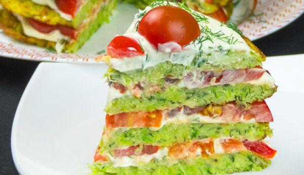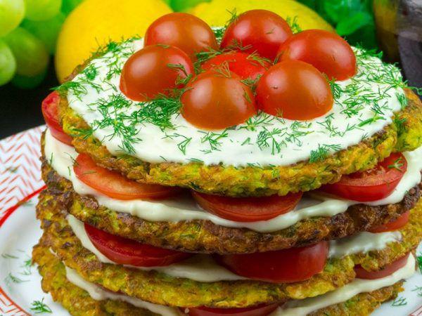 Mod de preparare: Dați dovleceii prin răzătoare, apoi puneți-i într-o strecurătoare, asezonați-i cu sare. Lăsați-i timp de 30 de minute să se scurgă zeama din ei. Într-un bol amestecați smântâna cu usturoiul pisat. Stoarceți bine toată zeama din dovlecei și amestecați-i cu mărarul tăiat mărunt, piperul și ouăle. Apoi treptat încorporați făina și amestecați bine compoziția. Într-o tigaie cu ulei încins puneți 3-4 linguri din compoziția pregătită mai devreme și cu ajutorul unei spatule nivelați-o și rumeniți-o pe ambele părți. Ungeți prima turtă din dovlecei cu sosul de smântână, apoi adăugați feliile de roșii pe toată suprafața. Astfel repetați procedura cu toate straturile. Într-un final ungeți suprafața cu sosul de smântână, puneți în mijloc jumătăți de roșii cherry și presărați mărarul tăiat mărunt.