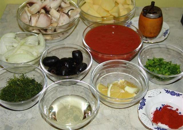 Ingrediente: 1 kg ciuperci, 400g masline, 3 cepe, 400 ml suc de rosii sau 500 g de rosii, 100 ml vin alb, 200 ml ulei, patrunjel, piper, 1 foaie de dafin, 1/2 lamaie mare, fara coaja.