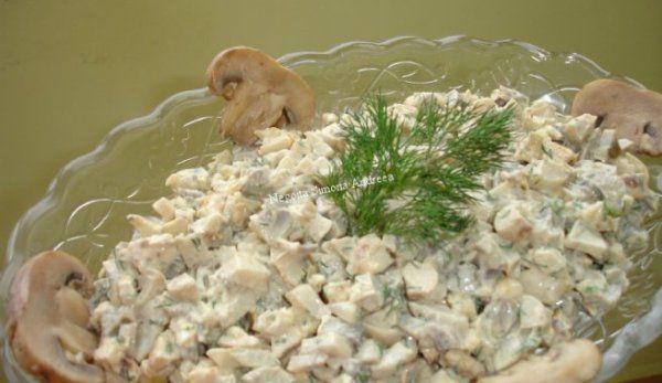 Mod de Preparare: Ceapa se caleste timp de 5 minute in ulei se adauga apoi ciupercile si se mai calesc 10 minute amestecand. Se lasa la racit, se scurg si se amesteca cu maioneza, usturoi, patrunjel, sare dupa gust.