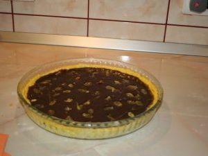 Crema: se bat 2 oua cu un pahar de zahar. Se adauga jumatate din lapte si apoi se incorporeaza faina si cacaua. Se pune si restul de lapte si se pune la foc mic, amestecandu-se pana se ingroasa. Cand s-a ingrosat, se ia de pe foc si se adauga untul. Se lasa la racit. Separat se freaca 3 galbenusuri cu un pahar de zahar pana se topeste. Se zbat cele 3 albusuri ramase si se incorporeaza in galbenusuri. Compozitia aceasta se amesteca in compozitia fiarta. Crema rezultata se toarna in tava, se taie marginile aluatului ca sa aiba un aspect frumos si se da la cuptor pe care trebui sa-l avem incalzit deja. Se lasa la cuptor cam o ora si jumatate.