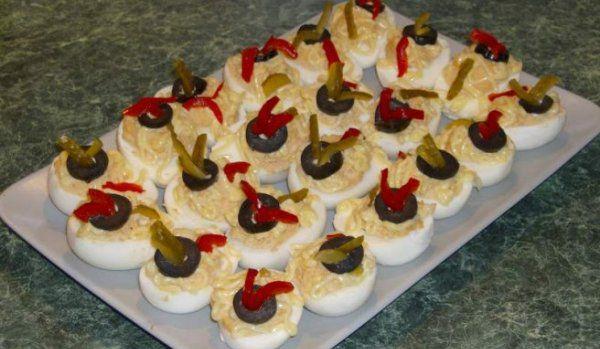 Mod de Preparare: Fierbeti 9 oua tari, le puneti in apa rece cateva minute, apoi le curatati si le lasati sa se raceasca bine. Taiati in jumatati si scoateti galbenusurile, pe care le puneti in robot impreuna cu sunca, untul, mustarul, sarea piperul si smantana. Tocati marunt, iar cu pasta obtinuta umpleti jumatatile de ou, decorati cu putin ardei rosu si o frunza de patrunjel, ideal ar fi gogosar acru.