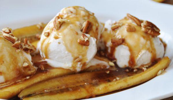 Mod de Preparare: Zaharul se caramelizeaza intr-o tigaie, pana prinde o culoare maro inchis. Trebuie avut grija sa nu se arda. Bananele se taie, in bucati nu prea mici, pentru ca isi vor reduce volumul cand sunt caramelizate, si se adauga la caramel. Se tin pe foc in jur de 2-3 minute, amestecandu-se. Se toarna cognacul si se flambeaza. Romul se adauga in tigaie, peste caramel si banane si se amesteca bine. Tot maglavaisul il torni in pahare de martini si adaugi inghetata de vanilie deasupra.