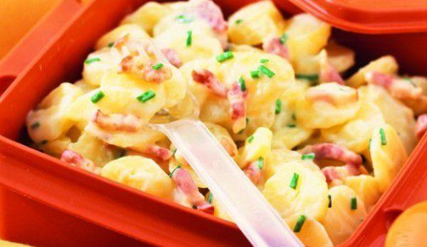 Mod de preparare: Alegi cartofi sănătoşi, îi speli şi îi pui la fiert în coajă. Separat, tai baconul feliuţe, toci ceapa verde şi căţeii de usturoi. Pui unt într-o tigaie, îl topeşti, adaugi ceapa şi laşi la călit. Adaugi baconul, usturoiul, sarea şi piperul şi mai laşi la foc mic. Torni smântâna, laşi să dea câteva clocote, aproximativ 10 minute, ca să se combine aromele şi dai deoparte. Tai cartofii rondele şi îi amesteci cu combinaţia din tigaie. Salata este foarte bună caldă. Dacă vrei, poţi presăra peste ea şi mărar tocat fin.