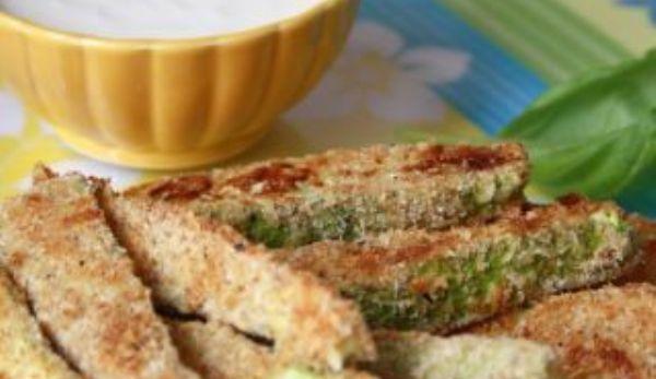 Mod de Preparare: Preincalziti cuptorul la 180 gradeC. Intr-un castron combinati pesmetul, parmezanul, sare si piper. In altul bateti ouale cu putina sare si piper. Taiati dovlecelul in fasii potrivite, pe care le tavaliti prin ou si dupa prin amestecul uscat. Le asezati pe o tava tapetata cu hartie de copt. Dati la cuptor pana devin aurii si crocante. Intre timp pregatiti sosul: amestecati smantana cu parmezanul si adaugati sare dupa gust.