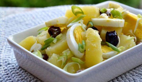 Mod de Preparare: Se fierb cartofii, se decojesc, se taie rondele si se aseaza intr-un castron suficient de mare. Se adauga ceapa si ardeiul taite solzisori, maslinele si dupa preferinta 1-2 castraveciori murati taiati cubulete. Peste ele se toarna amestecul de ulei, otet, mustar, sare si piper.