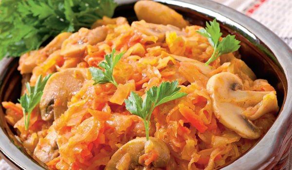 Mod de preparare: Ciupercile se trec sub un jet de apa rece si se lasa la scurs. Varza se gusta si, daca este prea acra, se lasa in apa rece. Se taie ceapa, se razuie morcovul si se pun la calit in ulei. Se adauga varza scursa si taiata. Se lasa sa se caleasca aproximativ 10 minute. Se pun ciupercile si bulionul desfacut cu putina apa, dafinul si piperul, se pune capac si se lasa pe foc 50 de minute.