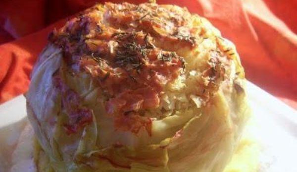 Mod de Preparare: Varza curatata si spalata o scobim, pana raman doar cateva straturi de frunze. Pieptul de pui il tocam impreuna cu ou, verdeata, sare, piper si busuioc. Ceapa o calim in ulei, adaugam sucul de rosii si orezul spalat. Lasam la fiert pana scade sucul de rosii. Lasam la racit,dupa care amestecam cu carnea tocata. Cu acest amestec umplem varza. Spatiul ramas il umplem cu varza marunt tocata. Se aseaza intr-o cratita. Adaugam restul de suc de rosii, presaram cu cimbru si completam cu apa pana la 3/4 din inaltimea verzei. Acoperim cu un capac si dam la cuptor pana este fiarta varza, in jur de-o ora. Se serveste cu mamaliguta si smantana.