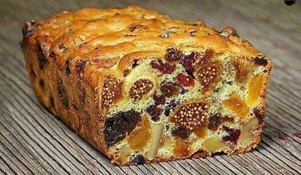 Mod de preparare: Se preîncălzeşte cuptorul la 180 de grade Celsius. Fructele uscate se taie mărunt şi se amestecă împreună cu nucile tăiate în bucăţi. Se bat ouăle şi se adaugă peste ele amestecul de fructe uscate. Apoi se încorporează zahărul, făina şi praful de copt, amestecând bine compoziţia. Se unge tava pentru chec cu puţin ulei înainte de a turna compoziţia în ea. Se introduce în cuptorul încins la 180 de grade Celsius şi se lasă 45 de minute.